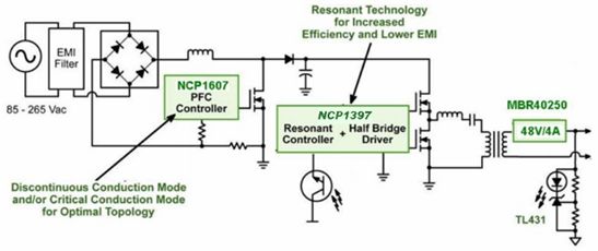 LLC拓?fù)浣Y(jié)構(gòu)采用串聯(lián)類型的諧振轉(zhuǎn)換器,能在相對寬的輸入電壓和輸出負(fù)載范圍下工作。此外,由于諧振儲能元件可以部分或完全集成在主變壓器中,LLC拓?fù)浣Y(jié)構(gòu)只需要數(shù)量有限的元器件。再加上在所有負(fù)載條件下,LLC拓?fù)浣Y(jié)構(gòu)的初級開關(guān)都能工作在零電壓開關(guān)條件,次級整流器都能工作在零電流開關(guān)條件。所以,LLC拓?fù)浣Y(jié)構(gòu)是高性價(jià)比、高能效及優(yōu)化了電磁干擾的解決方案。