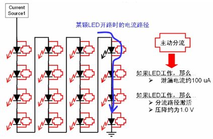 區(qū)域照明應(yīng)用中通常會采用多串LED,雖然LED本身可靠性高,但若LED串中的某個(gè)LED開路,那么整串LED就可能關(guān)閉,而街道照明等應(yīng)用中必須避免這種狀況,從而降低后期維護(hù)成本。為了增強(qiáng)LED串的可靠性,這種安森美半導(dǎo)體推出了NUD4700 LED電流旁路保護(hù)器。NUD4700器件是一款分流器件,當(dāng)LED串中某個(gè)LED開路時(shí),就會提供電流旁路,確保整串LED不會關(guān)閉;而且恰當(dāng)處理散熱的話,還可支持大于1 A的大電流,其工作原理如圖8所示。