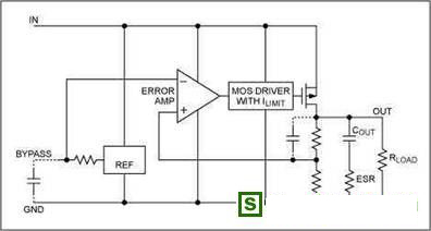 RF電路分為接收和發(fā)送兩部分,供電電壓典型值為2.6V至3.0V,其中低噪聲放大器(LNA)、混頻器、鎖相環(huán)(PLL)、壓控振蕩器(VCO)和中頻(IF)電路需要低噪聲、高PSRR的LDO。實際應用中,VCO、PLL電路的性能直接影響射頻電路指標,如發(fā)射頻譜的純度、接收器的選擇性、模擬收發(fā)器的噪聲、數(shù)字電路的相位誤差等。噪聲會改變振蕩器的相頻和幅頻特性,同時振蕩器環(huán)路也會進一步放大噪聲,可能對載波產(chǎn)生調(diào)制。LDO輸出噪聲受其內(nèi)部設(shè)計和外部旁路、補償電路的影響。如圖是線性穩(wěn)壓器的簡單框圖。導致LDO輸出噪聲的主要來源是基準