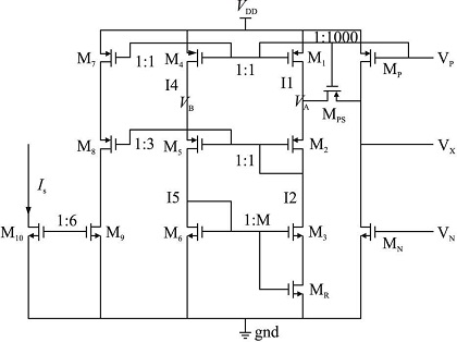 圖2所示電流檢測電路中, MP、MN 為功率管,M1 與M4、M2 與M5 的W/L相同, VP 為MP 的控制信號, MPS用作開關(guān), 其W/L比較大, 具有低導(dǎo)通電阻。在電流模DC /DC 轉(zhuǎn)換器中, 反饋控制環(huán)路只需檢測MP 功率管導(dǎo)通時(shí)的電流, 因此, 為降低功耗, 可控制電流檢測電路只在MP 功率管導(dǎo)通時(shí)工作, 即只檢測電感充電階段的電流, 而在MP 功率管截止時(shí), 電流檢測電路不工作, 進(jìn)而有效地減小了功率損耗。