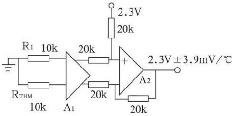 UC3909 內(nèi)部集成了具有鉛酸蓄電池溫度補償功能的電路如圖4 所示, A1 為電流/ 電壓轉換元件, 其輸入端分別接10 kΩ 普通電阻及10 k Ω 熱敏電阻。A2 與外接四個20 kΩ 電阻組成差動運算放大電路。RT HM 一般貼附在鉛酸蓄電池的表面殼體用于檢測其溫度, 當鉛酸蓄電池內(nèi)部溫度變化時, 通過熱敏電阻RTHM 的反饋使U C3909 的基準電壓2. 3 V 也隨溫度按- 3. 9 mV/℃ 的溫度系數(shù)變化。從而確保鉛酸蓄電池在浮充狀態(tài)下準確工作于安全的浮充電壓, 保護了鉛酸蓄電池。