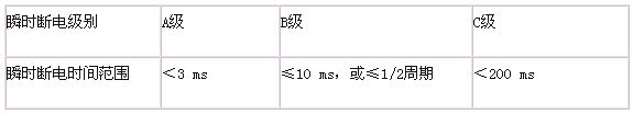 工業(yè)現(xiàn)場(chǎng)的供電品質(zhì)很差,常常不能達(dá)到國(guó)家對(duì)電網(wǎng)波動(dòng)等級(jí)中規(guī)定的最低標(biāo)準(zhǔn)C級(jí)。表1列出了國(guó)家標(biāo)準(zhǔn)對(duì)電網(wǎng)波動(dòng)等級(jí)的規(guī)定。當(dāng)供電電壓超過(guò)C 級(jí)規(guī)定時(shí),通常稱為過(guò)壓或者欠壓。而失壓又稱瞬時(shí)斷電。產(chǎn)生瞬時(shí)斷電,最常見(jiàn)的原因是用電設(shè)備突然短路而它的保險(xiǎn)絲還沒(méi)有熔斷的瞬間。另外開(kāi)關(guān)或刀閘觸點(diǎn)接觸不良或顫抖等也會(huì)產(chǎn)生瞬間斷電。瞬間斷電所允許時(shí)間國(guó)內(nèi)尚無(wú)標(biāo)準(zhǔn),表2列出了日本《工業(yè)用計(jì)算機(jī)環(huán)境標(biāo)準(zhǔn)》中規(guī)定的瞬間斷電級(jí)別。