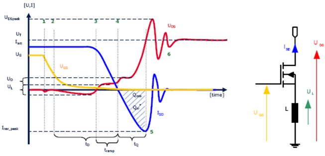 分析首先從開關(guān)的導(dǎo)通狀態(tài)開始:此時(shí),柵極電壓很高,漏源電壓幾乎為零,電流從源極流向漏極。在點(diǎn)1時(shí),柵極被關(guān)斷。在UDS波形中,這表現(xiàn)為柵極電容CG放電產(chǎn)生的負(fù)電壓驟降很小。此放電會在MOSFET的源極連接處產(chǎn)生具有大的電流變化(di/dt)的電流峰值。在感應(yīng)作用下,源極的這種電感會引起UDS波形發(fā)生壓降。