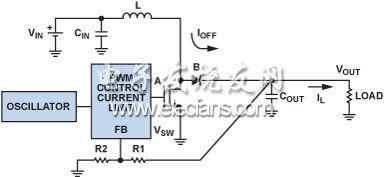使用肖特基二極管代替開關(guān)B的調(diào)節(jié)器定義為異步 (或非同步), 調(diào)節(jié)器,而使用FET作為開關(guān)B的調(diào)節(jié)器定義為同步調(diào)節(jié)器。圖3中,開關(guān)A和B已分別使用內(nèi)部NFET和外部肖特基二極管來實施,從而形成異步升壓調(diào)節(jié)器。對于需要負(fù)載隔離和低關(guān)斷電流的低功耗應(yīng)用,可添加外部FET,如圖4所示。將器件的EN引腳驅(qū)動至0.3 V以下便可關(guān)斷調(diào)節(jié)器,使輸入與輸出完全斷開。