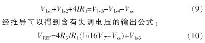 基準(zhǔn)源中運(yùn)放的設(shè)計(jì)是非常重要的,運(yùn)放的失調(diào)是基準(zhǔn)源的一個(gè)主要誤差源。由于不對(duì)稱性,運(yùn)放會(huì)受到輸入失調(diào)的影響。假設(shè)失調(diào)電壓為Vos,經(jīng)計(jì)算得到含失調(diào)電壓的輸出公式為: