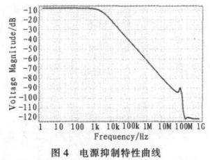 圖4是在1 Hz到10 GHz的范圍進(jìn)行掃描所得到的不同的電源抑制情況。低頻時(shí)抑制情況不太好,在-10 dB左右,還有待于提高;高頻抑制情況很好,基本穩(wěn)定在-120 dB左右。與傳統(tǒng)電路相比,本文提出的這種電路可以用于在各種系統(tǒng)尤其是高頻系統(tǒng)中,這一點(diǎn)是傳統(tǒng)電路所無(wú)法比擬的。