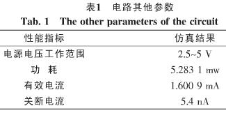 電路的其他方面的性能仿真結(jié)果如表1所示。表1的仿真結(jié)果是在電源電壓為3.3 V的條件的測(cè)得的。有效電流指的是在電路正常工作的情況下從電源到地之間的電流,關(guān)斷電流指的是在電路不工作的情況下從電源到地的漏電流。