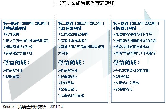 十二五期間是智能電網的全面建設期,將積極建立技術標準體系,以及關鍵技術和設備的研制。受益領域包括特高壓設備、變電智能化、智能電表、配電自動化,以及充電站和充電樁。其中智能變電是物聯(lián)網應用中投資力道最大的環(huán)節(jié),市場規(guī)模達740億元人民幣,是十二五期間智能電網的投資首選,企業(yè)的技術與通路能力是勝出關鍵。