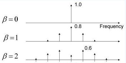 圖1顯示了通過正弦波改變調(diào)制指數(shù)產(chǎn)生的影響。當(dāng)Β=0時(shí),沒有出現(xiàn)頻移,只有一條譜線。當(dāng)Β=1時(shí),頻率特征開始延伸,且中心頻率分量下降了20%。當(dāng)Β=2時(shí),該特征將進(jìn)一步延伸,且最大頻率分量為初始狀態(tài)的60%。頻率調(diào)制理論可以用于量化該頻譜中能量的大小。Carson法則表明大部分能量都將被包含在2*(Δf+fm)帶寬中。