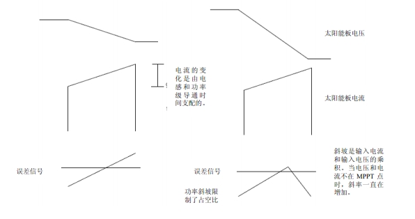 為了從功率可變的電源(即太陽(yáng)能電池板)析取出最大的功率,太陽(yáng)能控制器必須采用 MPPT。MPPT 必須首先找到最大功率點(diǎn)并及時(shí)調(diào)整環(huán)境條件,以保持控制器接近最大功率點(diǎn)。動(dòng)態(tài) MPPT 用在系統(tǒng)發(fā)生改變的情況下。由于每個(gè)開(kāi)關(guān)周期都在發(fā)生變化,太陽(yáng)能電池板汲取的功率也會(huì)在每個(gè)周期有明顯的改變。動(dòng)態(tài)MPPT利用太陽(yáng)能電池板的電壓驟降乘以每個(gè)開(kāi)關(guān)周期增加的電流,以確定將要產(chǎn)生的誤差信號(hào)來(lái)調(diào)節(jié)占空比。動(dòng)態(tài)響應(yīng)可檢測(cè) IV 曲線的斜率,從而建立一個(gè)功率斜坡,從誤差信號(hào)相交點(diǎn)建立一個(gè)代表占空比的功率。當(dāng)斜坡變化斜率從正到負(fù)時(shí)該周期結(jié)束,如圖 2 所示。