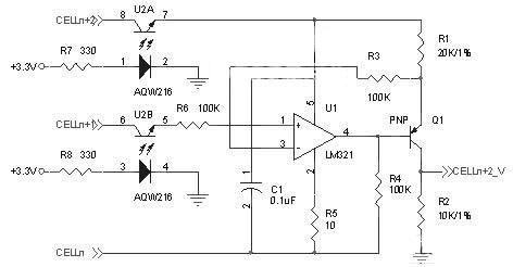 由于本文實驗中采用的采樣電路參考電壓為2.5V,因此需要把電池電壓進行2倍衰減,所以選擇了R1=2R2,電路中電容C1為去耦電容,電阻R5為限流電阻,電阻R4用于保證電路可靠工作,為了減少電壓檢測電路的漏電流,在每節(jié)單體電池電壓檢測線上加入AQW216光電繼電器作為檢測控制開關(guān),如圖2所示,當(dāng)需要檢測電池電壓時,通過控制端打開光電繼電器,檢測完關(guān)閉光電繼電器,可有效減少檢測時的漏電流對電池組一致性的影響。