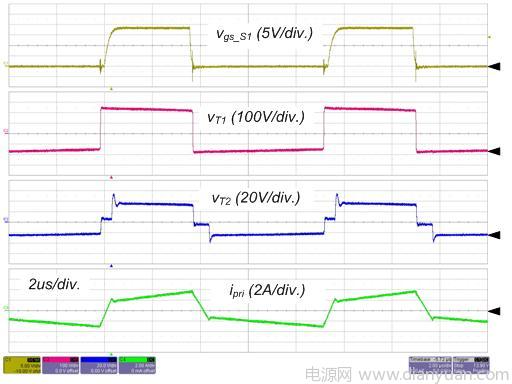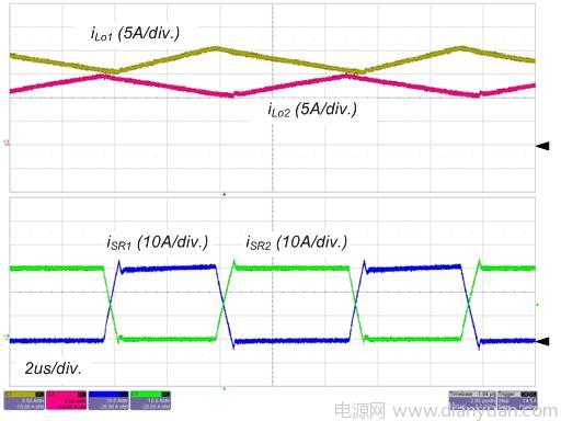 圖 4 和圖 5 所示為轉換器在標稱輸入和全負載情況下的實驗波形。S1 的柵極信號,主變壓器的初級端和次級端的電壓和初級端電流如圖4所示。請留意這些波形與理論分析很好地吻合,包括ZVS 運作。輸出電感電流和 SR 的電流如圖 5 所示,由于占空比和寄生組件,輸出電感電流是不均衡的,這意味著平均勵磁電流小于中心抽頭式配置(注 1)。