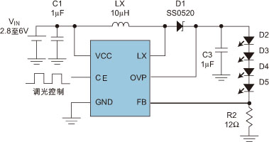圖1:Step-UP DC/DC 開關(guān)電源實(shí)現(xiàn)LED驅(qū)動的典型應(yīng)用線路。