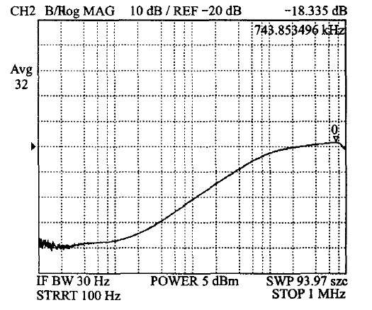 5 V 電壓的PSR測(cè)試波形如圖10所示。由此圖可見(jiàn),其PSR可以達(dá)到-60 dB.該供電模塊在工作頻率為40~130 kHz的綠色多模式反激式控制器中的應(yīng)用表明,它對(duì)來(lái)自電源的干擾具有較好的抑制能力。