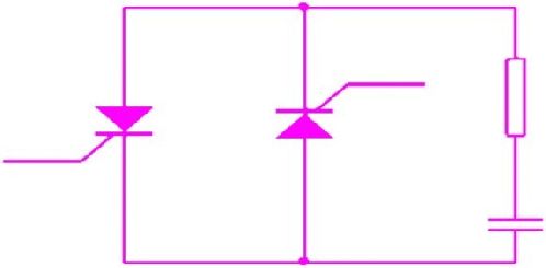 阻容吸收電路中電容器把過電壓的電磁能量變成靜電能量存貯,電阻防止電容與電感產(chǎn)生諧振、限制晶閘管開通損耗與電流上升率。這種吸收回路能抑制晶閘管由導(dǎo)通到截止時(shí)產(chǎn)生的過電壓,有效避免晶閘管被擊穿。