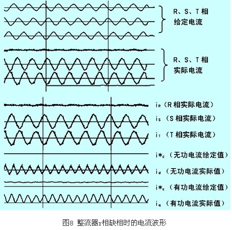 如果由于線路缺相,CT也檢測不到電流(例如r相電流ir=0),則由于平衡控制會(huì)使另外兩相電流的相位差變?yōu)?80°,幅值相等(當(dāng)然為補(bǔ)償“缺相”的那相電流,另兩相電流將增大),以滿足矢量和為零的控制要求,如圖8所示。此時(shí),根據(jù)r、s、t相實(shí)際電流計(jì)算出的有功分量電流iq和無功分量電流id已經(jīng)不是正常直流量,而是含有2倍頻(相電流頻率)成份的交流量,參見圖8,整流器無法正常工作。
