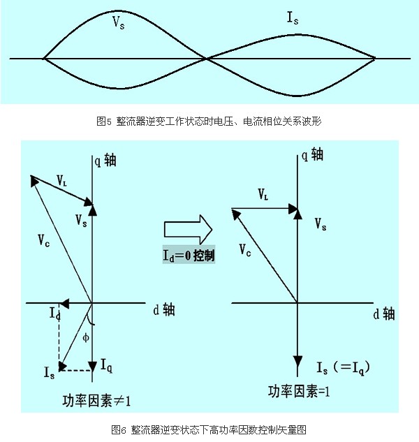 鑒于整流器和逆變器相互之間是分別獨(dú)立運(yùn)行的,它們是分別獨(dú)立可控的,能對整流器的功率因數(shù)進(jìn)行獨(dú)立控制,而不受馬達(dá)負(fù)荷及運(yùn)轉(zhuǎn)速度的影響,如圖2所示。