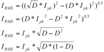 下面是輸入電容中RMS電流的推導(dǎo)過(guò)程,其假設(shè)電感無(wú)窮大。它以矩形脈沖(D0.5*Ipk)的RMS電流作為開(kāi)始,并去除了DC組件(D*Ipk)。