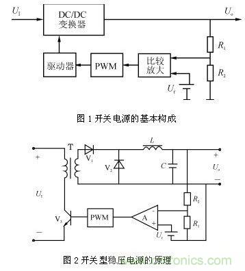 開關(guān)電源采用功率半導(dǎo)體器件作為開關(guān)器件,通過周期性間斷工作,控制開關(guān)器件的占空比來調(diào)整輸出電壓。開關(guān)電源的基本構(gòu)成如圖1所示,其中DC/DC變換器進(jìn)行功率轉(zhuǎn)換,它是開關(guān)電源的核心部分,此外還有起動、過流與過壓保護(hù)、噪聲濾波等電路。輸出采樣電路(R1、R2)檢測輸出電壓變化,與基準(zhǔn)電壓Ur比較,誤差電壓經(jīng)過放大及脈寬調(diào)制(PWM)電路,再經(jīng)過驅(qū)動電路控制功率器件的占空比,從而達(dá)到調(diào)整輸出電壓大小的目的。圖2是一種電路實(shí)現(xiàn)形式。