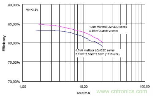 圖 10 顯示整個(gè)鋰離子電池電壓范圍(2.7V~4.2V)內(nèi)均可以實(shí)現(xiàn) 80% 以上的效率。在此應(yīng)用中,使用了一個(gè)高度僅為 1.2mm 的電感 (Sumida CMD4D11-4R7, 3.5mm*5.3mm*1.2mm)。 從圖 10 中的效率曲線可以看出:在大多數(shù)應(yīng)用中,升壓轉(zhuǎn)換器可以實(shí)現(xiàn)比充電泵解決方案更高的效率。但是,在無線應(yīng)用中使用升壓轉(zhuǎn)換器或充電泵時(shí)還需要考慮 EMI 問題。