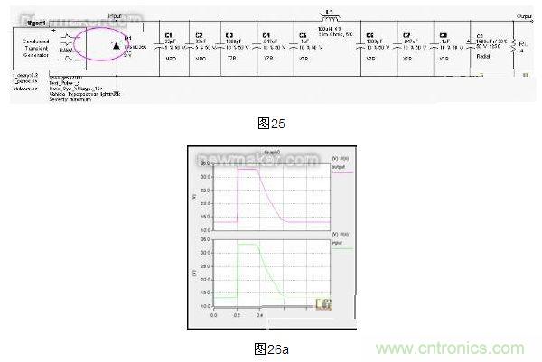 在ISO 7637-2:2004、GMW3100-08.2001:3.2.1.3等標準中規(guī)定了沿電源線的電瞬態(tài)傳導的干擾脈沖的抗擾性失效模式、嚴重程度和測量,提供了5 種典型脈沖波形,雖然沒有涵蓋所有可能出現(xiàn)在車輛上的各種瞬態(tài)脈沖,但適用于各種動力系統(tǒng)的道路車輛,例如:火花點火發(fā)動機、壓燃式發(fā)動機、電動機、混合動力驅(qū)動系統(tǒng)。針對這5種典型的瞬態(tài)傳導脈沖,在Saber仿真環(huán)境中進行該電源濾波器電路(圖13)的仿真如下: