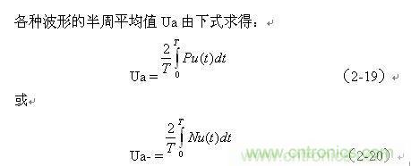 (2-19)、(2-20)式中,Ua和Ua-分別為各種波形的正、負半周平均值,Pu(t)和Nu(t)分別為各種波形的正波形函數(正半周)和負波形函數(負半周),T為所選波形的周期。大部分交流電壓波形,其正、負半周平均值的絕對值都相等,但符號相反。