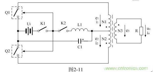 在圖2-11中,開機時,驅動電路電源開關K1首先接通,電源Ui首先給電源開關管Q1、Q2的驅動電路加電;然后開關管電源開關K2接通,由于L1的作用,C1兩端的電壓只能緩慢上升,以保證加到變壓器初級線圈的電壓不會突然升高,使流過變壓器初級線圈的電流過大,導致變壓器鐵芯出現飽和;關機時,開關管電源開關K2首先關斷,而后驅動電路電源開關K1再關斷,由于C1兩端的電壓緩慢下降,使變壓器鐵芯可進行充分退磁,以保證下次開機的時候,變壓器鐵芯磁滯回線的初始相位總是從0開始。