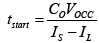 在啟動開始時(shí),輸出電容器的平均充電電流為正值,充電電流等于(IS-IL),如等式1所示。在VO上升至VOCC之前,輔助匝電壓低于VDD,此時(shí)CDD無法通過輔助匝充電。但在此期間,CDD會被Irun和柵極驅(qū)動電流放電。如果 VDD低于VDD(off),UCC28700器件就會關(guān)斷。為確保器件順利啟動,在ta內(nèi)VDD必須大于VDD(off)。在等式8和等式9中,應(yīng)用了一個臨界條件。Tstart是VO從0上升至VOCC的時(shí)間。等式2是VOCC和VDD(off)的關(guān)系。在等式8 中,有1mA的估計(jì)柵極驅(qū)動電流,而且為VDD添加了1V的裕度。VCST是芯片選擇閾值電壓。在啟動開始時(shí),UCC28700 VS引腳上的電壓為低,因此VCST保持其最大值。