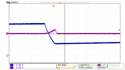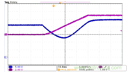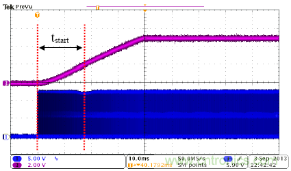 圖4是UCC28700的啟動波形,CH1是MOSFET柵極驅(qū)動信號,CH3是輸出電壓。該器件啟動順暢,沒有過沖和聲頻噪聲。該圖顯示,UCC28700器件有非常好的啟動性能。在圖4中,tstart接近18ms,與計(jì)算結(jié)果吻合。