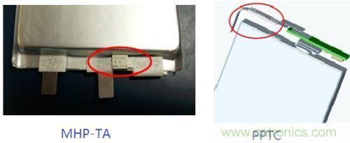 因此,不論哪種方式的快速充電,都是通過提高充電電流或功率來加速鋰電池芯內(nèi)部的反應(yīng)來實(shí)現(xiàn)的,必須通過更多的保護(hù)來防止由于電池芯的熱失控而引起的起火甚至爆炸。TE的PPTC和MHP-TA 可以有效地提供這種保護(hù),MHP-TA是結(jié)合了雙金屬片和PPTC的溫度/電流保護(hù)器件,溫度保護(hù)更加精確,可以適用于電流較大、溫度保護(hù)要求更高的電子設(shè)備,如:智能手機(jī)、平板電腦、超級本、筆記本電腦等。MHP-TA及PPTC的特性及應(yīng)用如下圖,緊貼電池芯的設(shè)計(jì)可以使MHP-TA和PPTC更好的感測電池溫度,當(dāng)電池溫度異常升高時(shí)可以呈現(xiàn)高阻,阻礙電池的充放電電流,確保電池的安全使用。