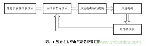 傳感器模塊實時的檢測實際情況并反饋給控制部件。簡單講,注射泵的電氣部分的工作原理如下圖2: