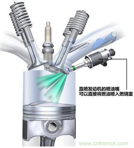 缸內(nèi)直噴,顧名思義就是直接將燃油噴入氣缸內(nèi)與空氣混合的技術(shù)。與傳統(tǒng)歧管噴射的意義不同,缸內(nèi)直噴將噴射壓力更進(jìn)一步提高,使燃油霧化更加細(xì)致,真正實(shí)現(xiàn)了精準(zhǔn)地按比例控制噴油并與進(jìn)氣混合,同時(shí)消除了缸外噴射的缺點(diǎn)。在發(fā)動(dòng)機(jī)低轉(zhuǎn)速低載荷時(shí),延遲噴射,在活塞進(jìn)行壓縮沖程最后階段時(shí)噴射,利用空氣渦流,使燃油聚集在火花塞附近,分層燃燒實(shí)現(xiàn)節(jié)油的目的,但當(dāng)發(fā)動(dòng)機(jī)轉(zhuǎn)速上去,載荷上去時(shí),還是要提前噴射,在吸氣沖程就將燃油噴射進(jìn)去,使油氣均勻混合燃燒。
