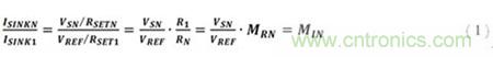 最終MOSFET(金氧半場效晶體管)源電壓VS以及RSET電阻決定著各柱上的灌電流(sink current);通過去除來自外部電流沉柱的反饋(即所有N》1),已失去對(duì)VSN的直接控制。因此,RSETN必須精心選擇以生成預(yù)期的任意第N個(gè)柱的灌電流,即ISINKN。仔細(xì)觀察上面的圖1,很容易得出定義偏置網(wǎng)絡(luò)第N個(gè)柱電流與第1個(gè)柱電流的比值的等式︰