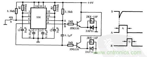 如下是由一片556(雙555)組成的兩級(jí)定時(shí)器電路,第一級(jí)定時(shí)器被開關(guān)S觸發(fā)時(shí)產(chǎn)生延遲脈沖A驅(qū)動(dòng)繼電器K1, A的延遲時(shí)間 t1 = ~1.1 R1xC 1