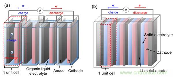 下圖對比了傳統(tǒng)鋰離子電池(a圖)和雙極性鋰電池(b圖,這里是以金屬鋰和全固態(tài)為例)。a圖中,每個電池單元unit cell包括了正極(一般涂覆在Al基材)、負極(一般涂覆在Cu基材);b圖中,每個電池單元unit cell同樣包括了正極、負極,但是正極、負極活性材料共用一個基材:當兩個電池單元串聯(lián)起來時,雙極性電極的一側在當前單元電池作為負極,另一側在相鄰單元電池中是作為正極。