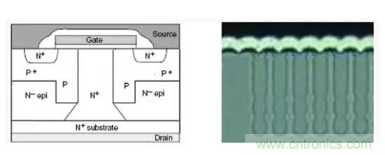 通常,高壓的功率MOSFET采用平面型結(jié)構(gòu),其中,厚的低摻雜的N-的外延層,即epi層,用來保證具有足夠的擊穿電壓,低摻雜的N-的epi層的尺寸越厚,耐壓的額定值越大,但是其導(dǎo)通電阻也急劇的增大。導(dǎo)通電阻隨電壓以2.4-2.6次方增長,這樣,就降低的電流的額定值。為了得到一定的導(dǎo)通電阻值,就必須增大硅片的面積,成本隨之增加。如果類似于IGBT引入少數(shù)載流子導(dǎo)電,可以降低導(dǎo)通壓降,但是少數(shù)載流子的引入會降低工作的開關(guān)頻率,并產(chǎn)生關(guān)斷的電流拖尾,從而增加開關(guān)損耗。