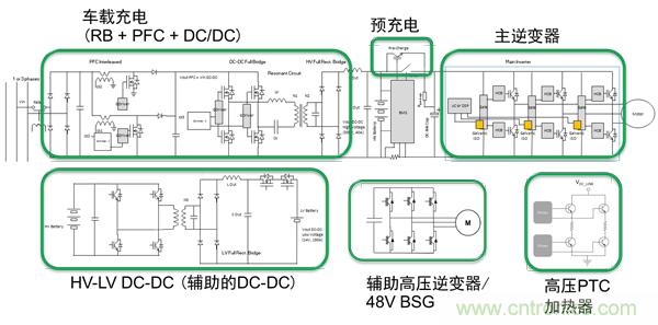 HEV/EV的重點應用有:車載充電器、電池管理、牽引逆變器、輔助逆變器、48 V皮帶啟動發(fā)電機(BSG)和DC-DC轉換器。