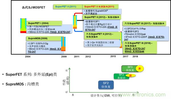 SJ MOSFET是利用電荷平衡技術實現(xiàn)出色的低導通電阻和低柵極電荷性能、從而最小化導通損耗并提供出色的開關性能的新型MOSFET。圖3所示為650 V SJ MOSFET技術演進。