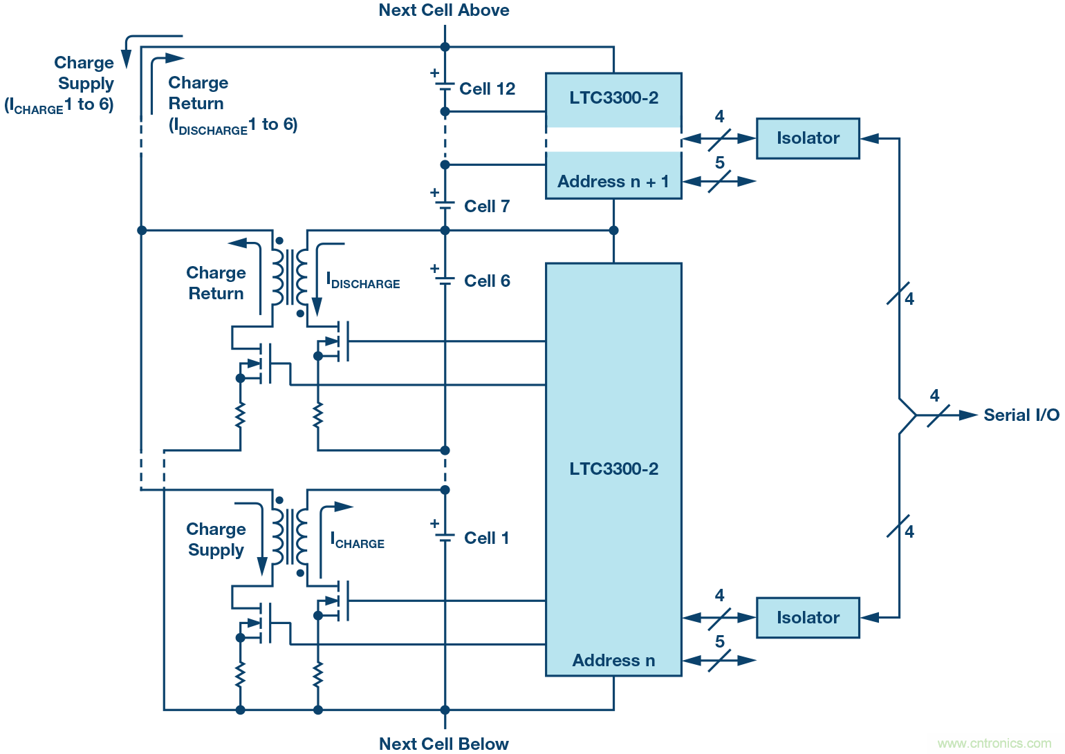圖4. LTC3300-2高效率、雙向、多電池單元主動均衡器。