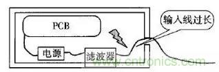 許多設(shè)備的電源線進(jìn)入機(jī)箱后,經(jīng)過很長的導(dǎo)線才接到濾波器的輸入端。例如,電源線從機(jī)箱后面板輸入,走行到前面板的電源開關(guān),又回到后面板接到濾波器?;蛘邽V波器的安裝位置距離電源線入口較遠(yuǎn),造成引線太長(如圖1所示)。