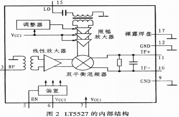 RF輸入端由1個集成變壓器和一個高線性差分放大器組成,變壓器的初級與RF輸入端(引腳3)和地連接,變壓器的次級內(nèi)部與差分放大器輸入端連接。