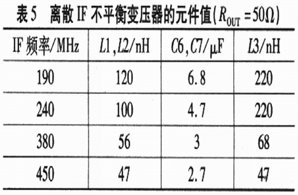 通用IF頻率下離散IF不平衡變壓器的元件值如表5所示。由于電路板和寄生效應的影響,表5中的值與計算值略有差別。