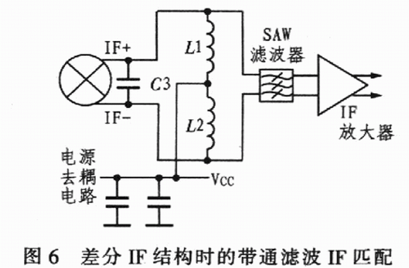 對整個差分IF結構來說,還可以從另一個角度考慮,不用IF變壓器,如圖6所示,這里,混頻器的lF輸出匹配直接通過1個SAW濾波器,混頻器IF端的電源由IF匹配網(wǎng)絡中的電感器提供。計算Ll、L22和C3的值,使之在期望的IF頻率上諧振,并獲得高品質因數(shù)和理想帶寬。調(diào)整L和C值,以消除混頻器內(nèi)部2.5 pF電容和SAW濾波器輸入電容的影響。在這種情況下,由于帶通網(wǎng)絡不變換阻抗,其差分lF輸出阻抗是400Ω。若SAW濾波器的輸入阻抗大于或小于 400 Ω,就需要附加匹配元件。