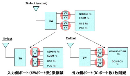 在手機(jī)的高頻率無線通信電路中使用的表面波濾波器,分為CDMA收發(fā)用的級(jí)間濾波器和GSM用的TOP濾波器等。村田的濾波器不僅具有低損耗和高抑制度的電特性,還由小型、薄型的各種產(chǎn)品尺寸構(gòu)成了豐富的商品線,可以對(duì)應(yīng)各種電路設(shè)計(jì)的需求。例如, 在多頻段發(fā)展的高頻無線通信電路中,為了減小電路基板上的貼裝面積,將兩個(gè)頻帶的單濾波器(產(chǎn)品尺寸1.35×1.05×0.5mm)合二為一,制造出了雙濾波器(產(chǎn)品尺寸1.8×1.35×0.5mm)。此外還運(yùn)用特殊的技術(shù)制造許多獨(dú)特的商品,如將雙層濾波器的輸入端合并為一個(gè)的1in4out產(chǎn)品,以及將平衡器的輸出端合并為一的2in2out產(chǎn)品等。通過共用輸入端可以節(jié)省原本用于分頻的開關(guān)(SW)。同時(shí),共用平衡輸出端可以使連接濾波器的高頻IC的端口數(shù)目減少(圖3)。這是在表面波濾波器的設(shè)計(jì)中通過調(diào)整阻抗和相位等方法,從而使差分端口實(shí)現(xiàn)共用。這些濾波器可以在多頻帶化發(fā)展的高頻無線電路中,為外圍電路的簡(jiǎn)化及電路整體的小型化做出貢獻(xiàn)。今后村田制作所將繼續(xù)致力于研發(fā)更小型化和高性能化,同時(shí)又具有輸入端以及輸出端共用功能的單濾波器、雙濾波器產(chǎn)品。