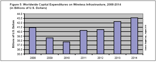 圖5所示為iSuppli公司對2008-2014年全球無線基礎(chǔ)設(shè)施設(shè)備資本支出的預(yù)測。