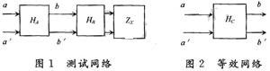 圖1中網(wǎng)絡(luò)HA,HB,ZX組成測(cè)試網(wǎng)絡(luò),圖2中HC為其等效網(wǎng)絡(luò)。HA,HB為無(wú)源線性雙口網(wǎng)絡(luò),起著匹配、隔離和濾波的作用,使得在bb′處能觀測(cè)到比較好的正弦波。HC的傳輸函數(shù)可以表示為: