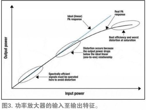 從圖3可以了解PA的工作原理。如藍(lán)線所示,理想的PA具有線性或一對(duì)一響應(yīng)。比如,如果提高10%的輸入功率,那么輸出功率也將相應(yīng)提高10%。而現(xiàn)實(shí)世界中PA的性能如黑色曲線所示,PA性能在輸出功率處于極低水平的情況下與理想的PA一致,而在較高的輸出功率水平下則會(huì)下降至理想PA之下。例如,如果將現(xiàn)實(shí)世界中PA的輸入功率提高10%,其輸出功率僅會(huì)提高9%。因此,即使在輸入功率不斷提高的情況下,PA的輸出功率也將停止上升。
