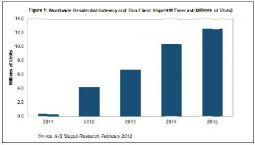 目前,住宅網(wǎng)關(guān)與充當(dāng)接收器的瘦客戶box很少,但隨著有線及無線運(yùn)營商開始推出提供更廣泛連接性與無縫接入的服務(wù),其數(shù)量將急劇增長。2012年,全球網(wǎng)關(guān)與瘦客戶box的出貨量將達(dá)到420萬個,而去年只有34.5萬個,2010年更是只有1000個。未來幾年其出貨量將繼續(xù)快速增長,到2013年達(dá)到680萬個,2014年上升到1040萬個,2015年達(dá)到1260萬個,如圖1所示。