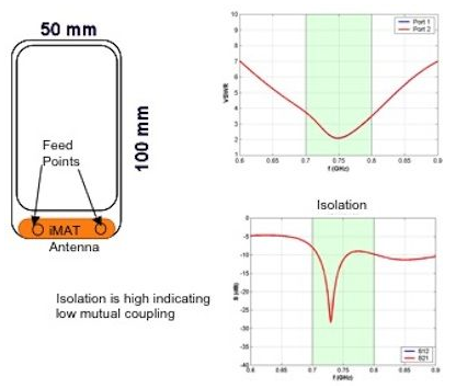 還有一種可行的解決方案,使用SkyCross公司提供的隔離模式天線技術(shù)(iMAT),從相同的天線結(jié)構(gòu)產(chǎn)生兩種不同的模式。iMAT天線結(jié)構(gòu)放置在手機(jī)的一端;兩個饋點分別運行不同的輻射模式。這兩個饋點是相互隔離的,不會發(fā)生互耦導(dǎo)致的損耗,因此每種模式的效率都很高。另外,輻射圖案是不同的,因此會產(chǎn)生一個較低的相關(guān)系數(shù)。圖4描述了iMAT天線的實現(xiàn)原理,從圖中可以看到,在相同天線結(jié)構(gòu)上的兩個饋點之間的隔離。