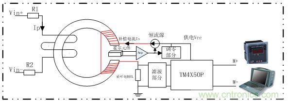 閉環(huán)式霍爾電流變送器是在直測式霍爾電流傳感器的基礎(chǔ)上發(fā)展起來的,主要由原邊電路、聚磁環(huán)、霍爾器件、次級線圈和放大電路、采樣電路、調(diào)零電路以及隔離變送模塊組成,如圖1。主回路電流IP 在聚磁環(huán)所產(chǎn)生的磁場,通過一個次級線圈的電流產(chǎn)生的磁場進(jìn)行補償,使霍爾器件始終處于檢測零磁通的工作狀態(tài)。流經(jīng)次級線圈的電流Is經(jīng)過精密電阻RL進(jìn)行采樣,為了減小恒流源的負(fù)載能力,此精密電阻RL的阻值較小。精密電阻將電流信號變換成mV的電壓信號,此信號經(jīng)過濾波器的濾波作用后直接接入金升陽TM系列信號調(diào)理模塊進(jìn)行信號隔離放大變換,變換換成工業(yè)需要的標(biāo)準(zhǔn)信號,如4-20mA、0-20mA、 l-5V、0-5V等標(biāo)準(zhǔn)直流信號,供給智能儀表顯示或者直接供給現(xiàn)場PLC或DCS系統(tǒng)使用。如果原邊電流Ip發(fā)生變化,則Ip產(chǎn)生的磁通發(fā)生變化,則在霍爾元件的兩表面產(chǎn)生電勢差,此電勢差經(jīng)過運放的放大作用,直接控制Is補償電流的大小,此補償電流恰好與被測電流的方向相反,從而補償了原來的磁場,使得霍爾器件處于零磁通的狀態(tài)中。所以Is的電流可以真實地反映出原邊Ip的電流的變化,反應(yīng)速度快。